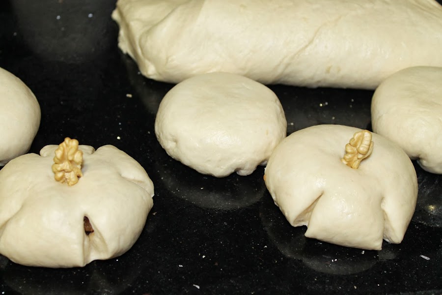 Una vez la masa llevado ha doblado su volumen sacamos el aire apretando bien y formamos bolas del mismo tamaño. Estiramos un poco y rellenamos de membrillo (aproximadamente del tamaño de una nuez). Cerramos en forma de bolita dejando las puntas abajo, hacemos algunos cortes, clavamos una nuez y dejamos llevar. Antes de hornear pincelamos con la mezcla de leche, colorante y miel tibia. Horneamos a 220º hasta que estén dorados. Se conservan bien incluso el día siguiente si se guardan en un recipiente herméticamente cerrado.