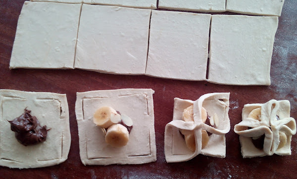 A cada cuadro le hacemos cortes en las esquinas como se ve en la fotografía de abajo y colocamos el relleno de Nutella, plátanos y avellanas.