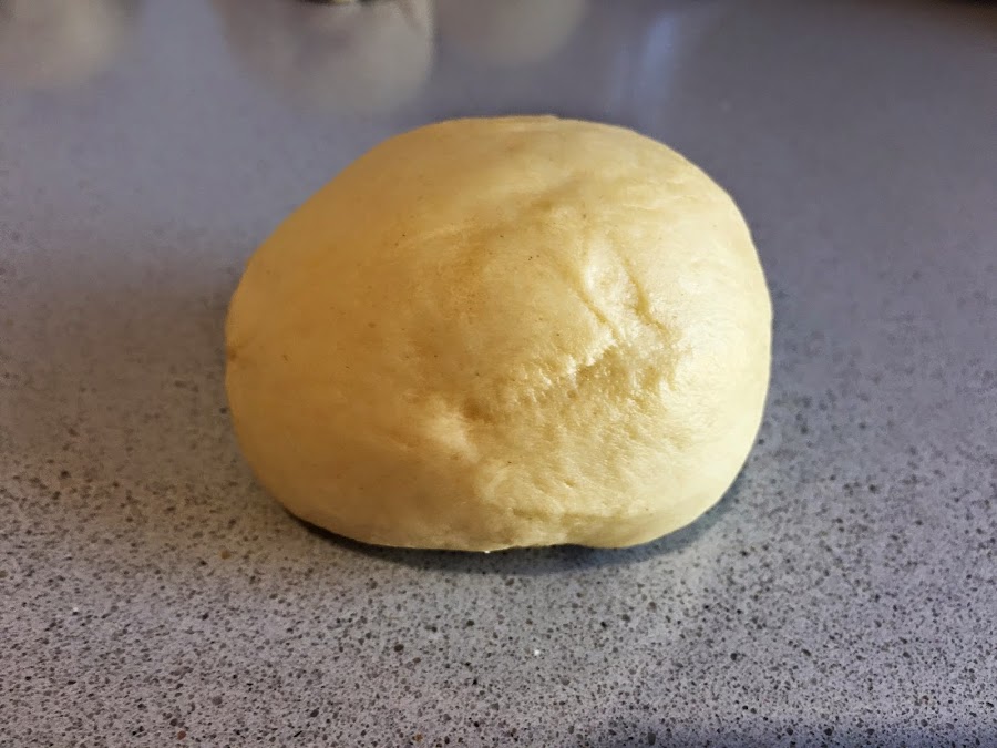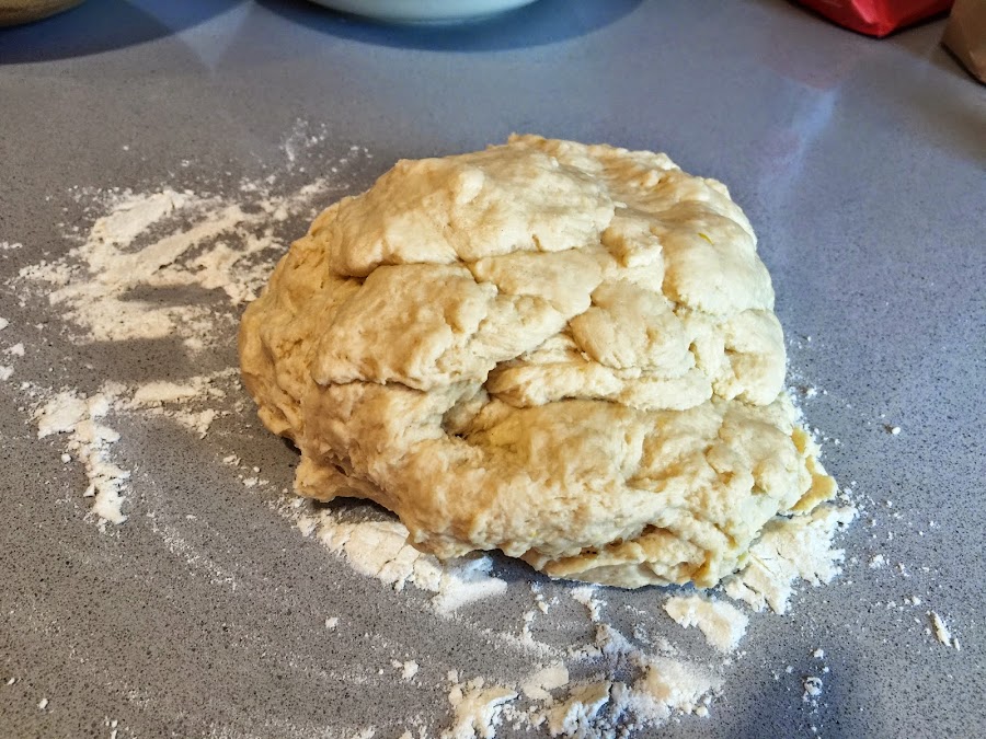 5. Cuando la masa haya reposado 10 minutos, ya no se pegará a las manos. Es el momento de sacarla del bol y amasar a mano. Ponemos un poquito de harina en el mármol y empezamos. Conviene amasarla, plegarla sobre si misma, durante 10-15 minutos.