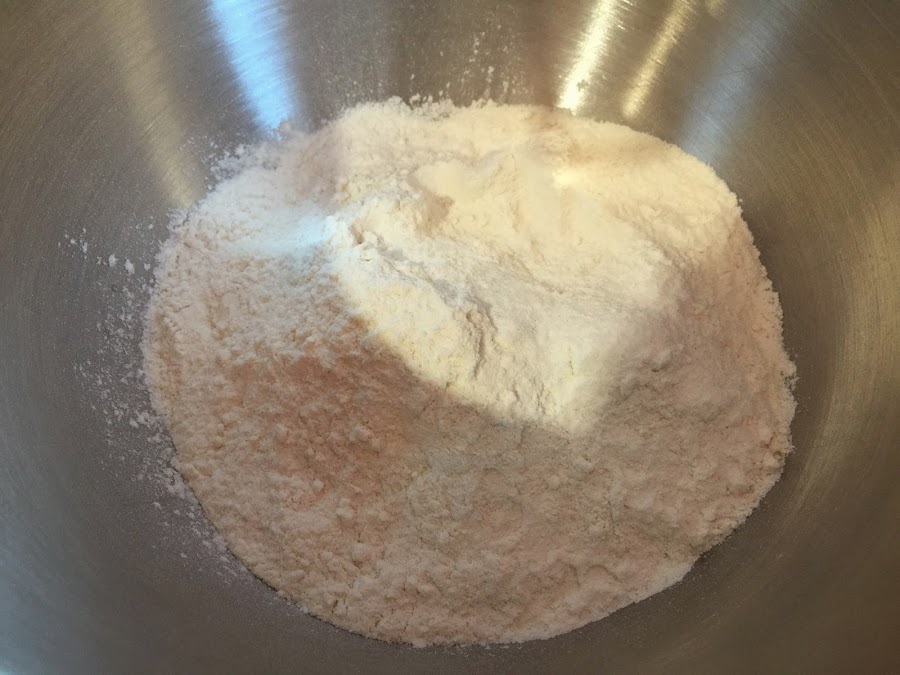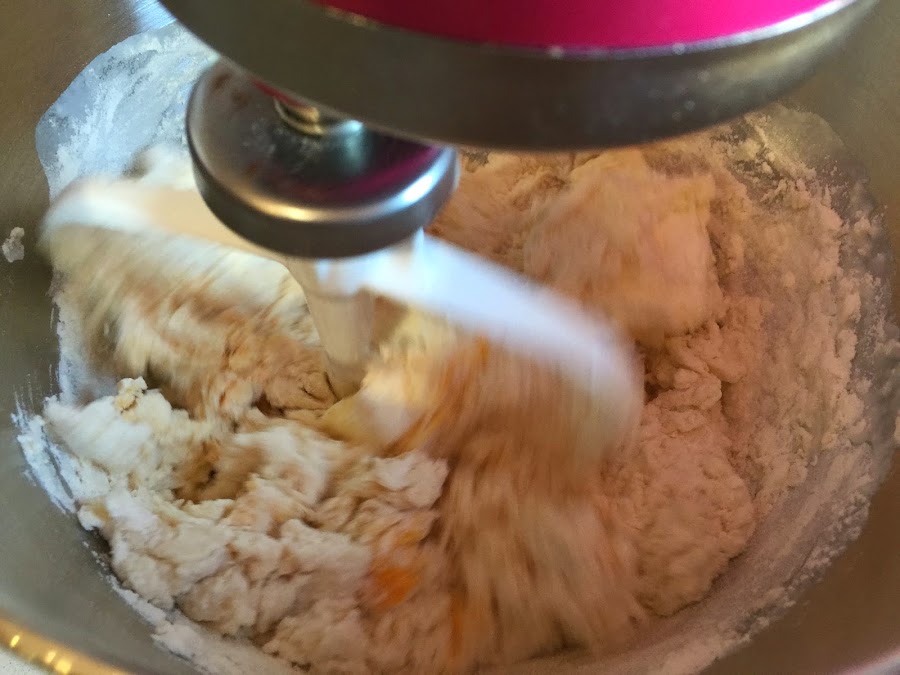 1. Ponemos en el bol de KA la harina de fuerza. Añadimos el huevo y la leche entera fresca. Conviene que la leche y el huevo estén a temperatura ambiente. Si la leche es fresca y entera mucho mejor, aportará un sabor mas intenso.