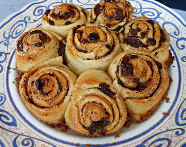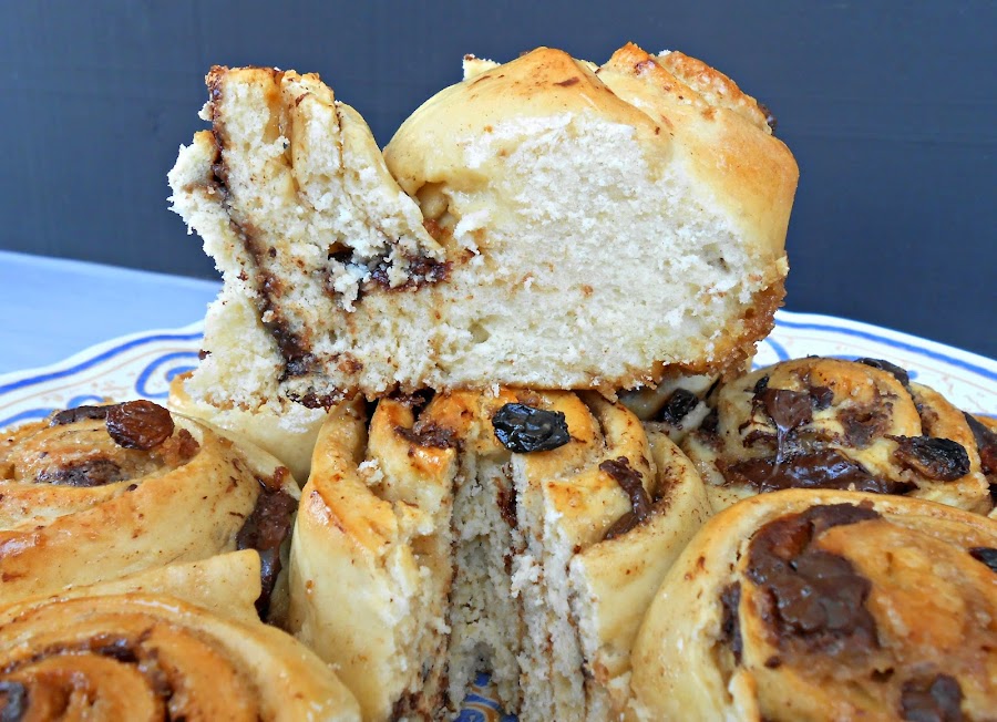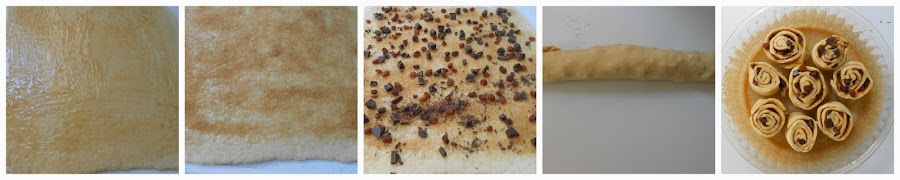 Volcamos la masa sobre la encimera (mesada) enharinada y extendemos con rodillo dandole forma rectangular, dejándolo de 1/2 cm. de espesor. Derretir la mantequilla y pincelar con ella la masa. Espolvorear con azúcar moreno y colocar las pasas de uva y el chocolate troceado.