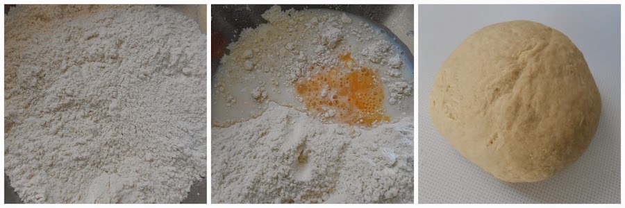 Colocamos en un bol la harina, la levadura, la sal y el azúcar, mezclamos bien y añadimos la mantequilla fría troceada y la deshacemos con los dedos obteniendo una textura arenosa. Batimos el huevo y lo añadimos junto con la leche. Mezclamos todo y unimos bien hasta lograr una masa suave que no se pega a los dedos.