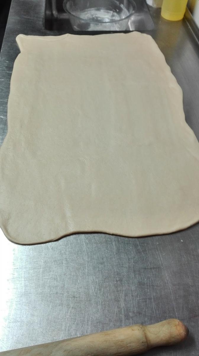Untamos la mesa de trabajo con mantequilla, sacamos la masa y la extendemos con el rodillo dejándola finita y formando un rectángulo grande