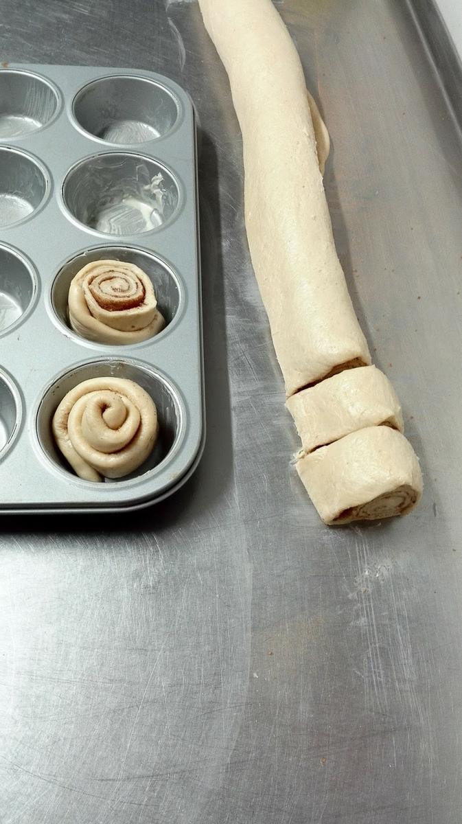 Enrollamos sobre si misma formando un cilindro largo y cortamos 24 rodajas de masa