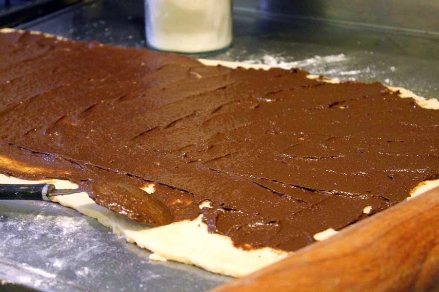 - Esparcir el relleno sobre la masa, dejando uno de los bordes largos sin relleno, para que al enrollar la masa se pegue