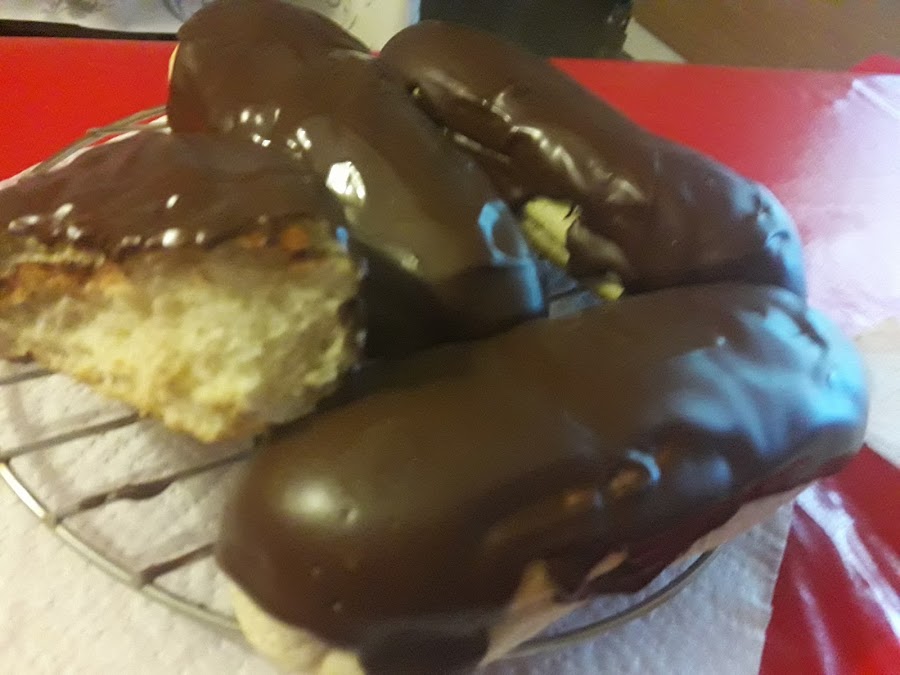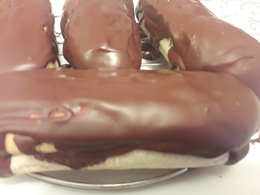 Sacar los bollos y ponerlos sobre una rejilla y bañarlos con el chocolate a continuacion meterlos en la parte baja de la nevera que endurezca el chocolate unos 10 min y listo deliciosos.