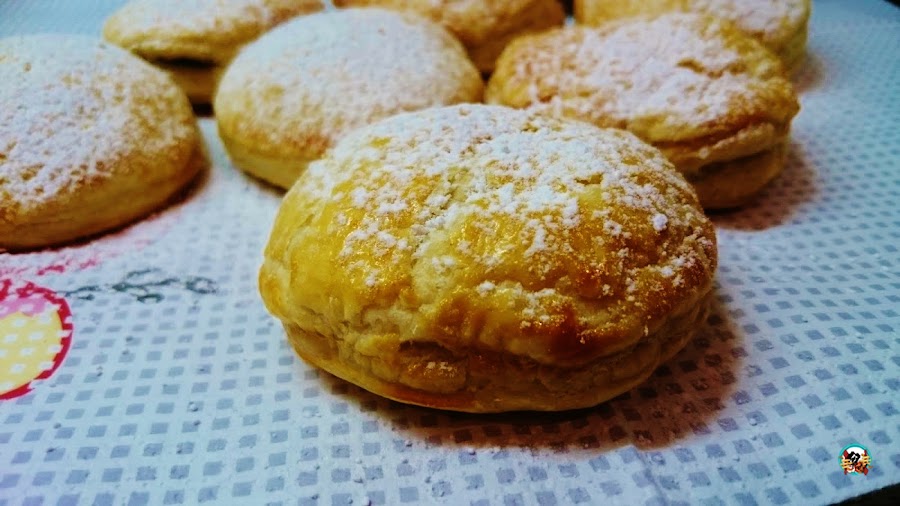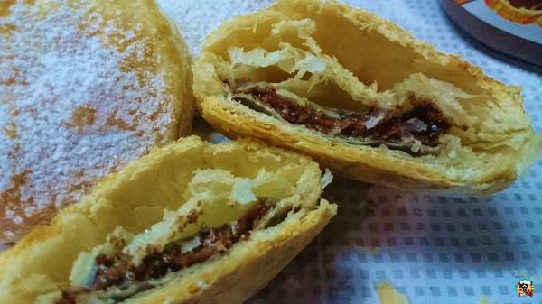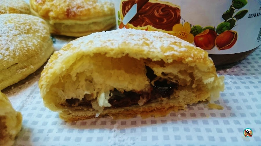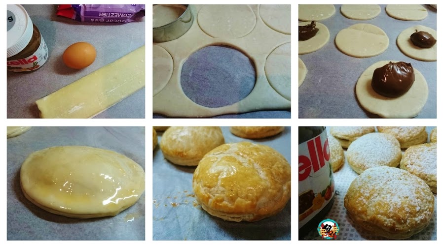 2.-Rellenamos la mitad de los círculos con una cuchara pequeña de Nutella. Cubrimos con el otro círculo de hojaldre y sellamos bien con los dedos para que no se habrán cuando estén en el horno. Pincelamos los bollos con un huevo batido y horneamos 30 o 35 minutos a 180ºC hasta que estén dorados por fuera. Dejamos