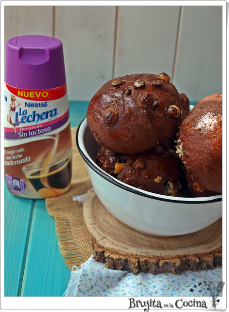 Hacer galletas o bollos es divertido porque es como jugar con plasti pero mejor, porque luego lo comemos y si se puede elegir siempre preferimos chocolate, por eso estos bollos están tan chocolateados. No llevan azúcar porque he usado leche condensada pero no cualquiera, de La lechera que es confianza y además desnatada y sin lactosa para quien tenga intolerancia. La he descubierto gracias a la Degustabox de este mes, en casa no tenemos problemas alimenticios, bueno la única yo que de mayor me ha dado al marisco, sí es una faena pero que le vamos a hacer.