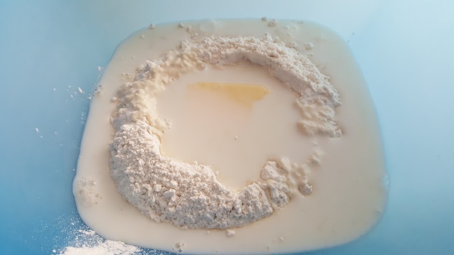1. - Ponemos en un bol la harina junto con la leche templada, y el resto de ingredientes excepto la levadura y mezclamos con una cuchara, para no "pringarnos" mucho las manos.