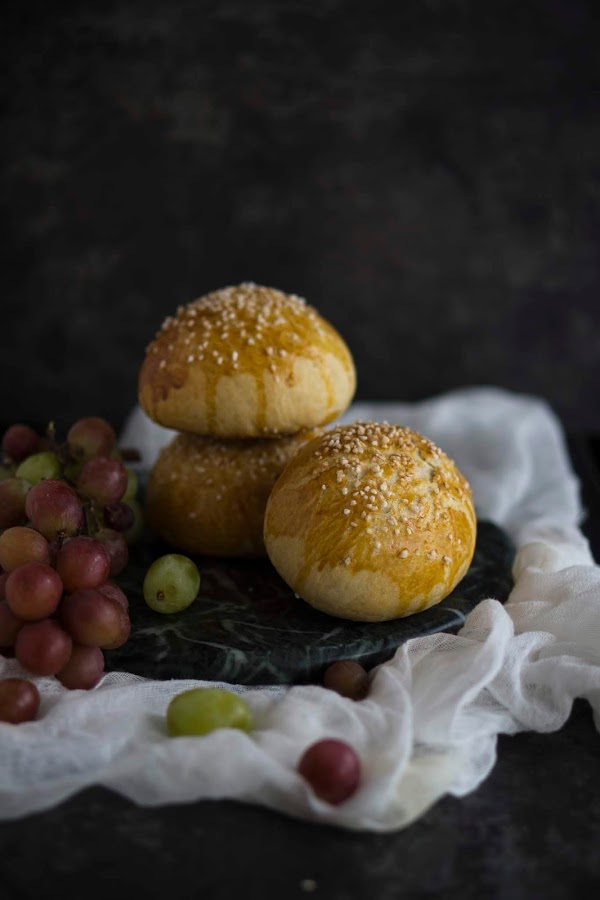 La variedad moscat, duraron horas en la mesa, eran tan dulces que eran puro caramelo, no quise ni pensar en las calorías, el gusto era tan bueno que no quise estropearlo imaginando mis futuras caderas!. Justo con esta variedad preparé los bollitos, si usas otra variedad quizá el mosto te quede más claro, pero eso no importa demasiado, el sabor seguro que será increíble igual. Os pongo la mitad de la receta, si queréis hacer el doble ya sabéis, a multiplicar por dos y listo!.
