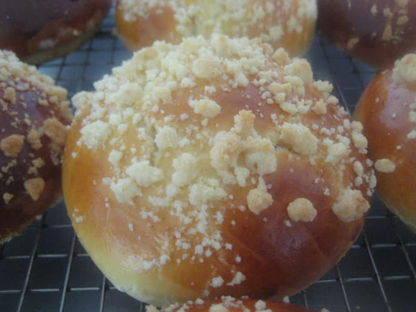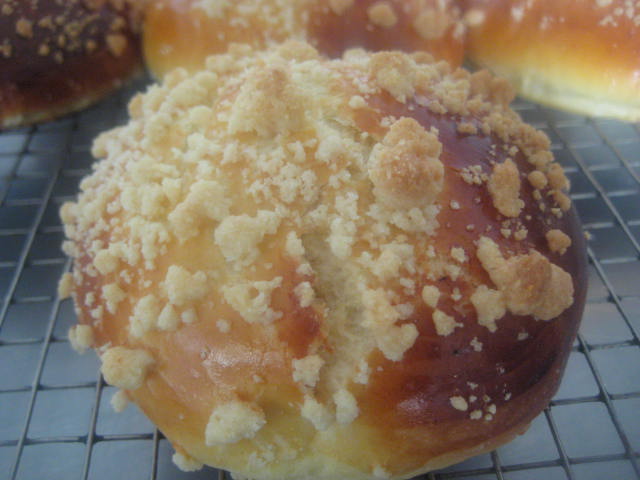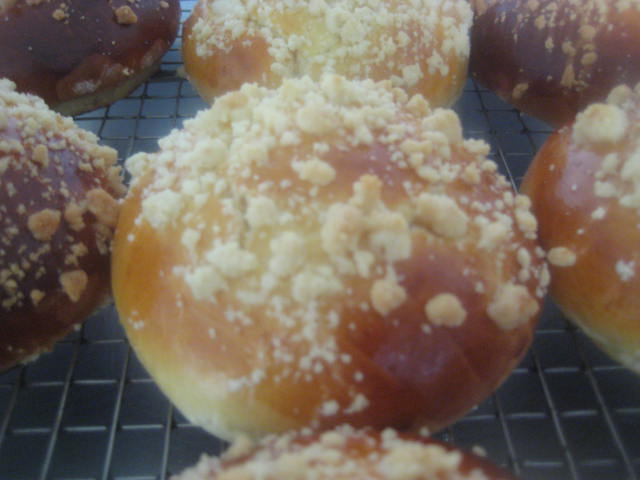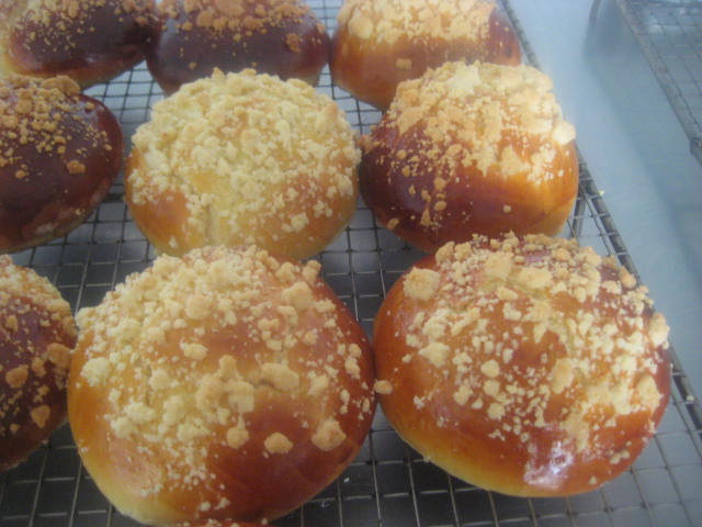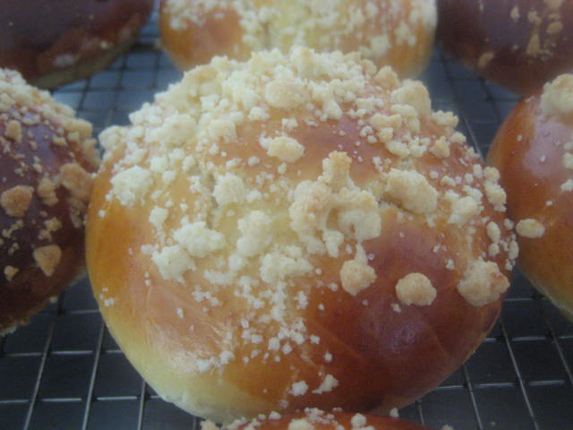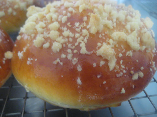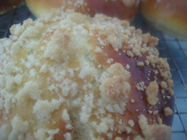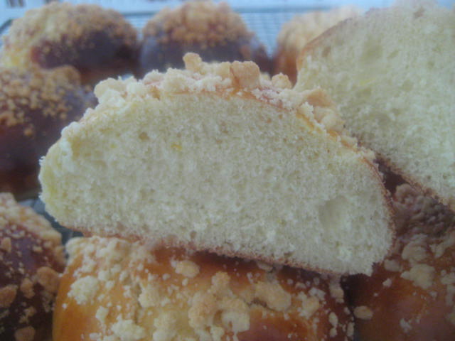 Pasado el tiempo de reposo de la masa, dividir en porciones de 75 gr. y bolear, dando así forma perfectamente redonda. Colocar en bandejas con papel de horno y reposar 15 minutos a temperatura ambiente. Pasado este tiempo achatar ligeramente con la palma de la mano y pincelar con huevo batido. Fermentar hasta que doblen su volumen. Entonces especiar sobre la superficie de los bollos de naranja el crumble de almendra con mucho cuidado para no desgasificarlos y cocer en el horno a 190º-200ºC hasta que hayan desarrollado bien y estén dorados, entre 10 y 15 minutos, depende de los hornos. Retirar de la bandeja y colocar sobre rejilla para que se enfríen totalmente antes de consumir.