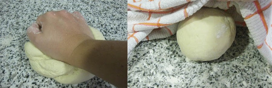 Una vez la tengamos lista , hacemos una bola , espolvoreamos la encimera y la cubrimos con un paño de cocina , La dejamos reposar 1 hora en ambiente cálido y lejos de corrientes de aire .