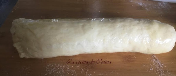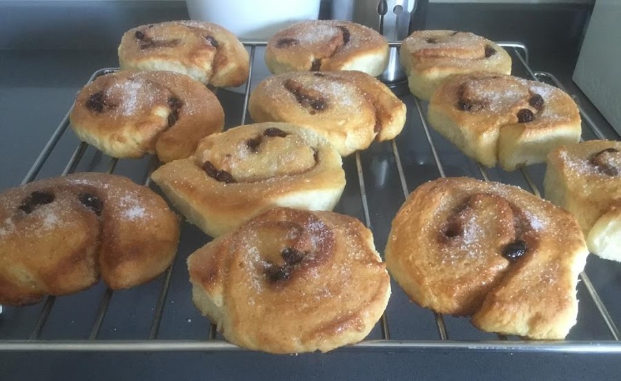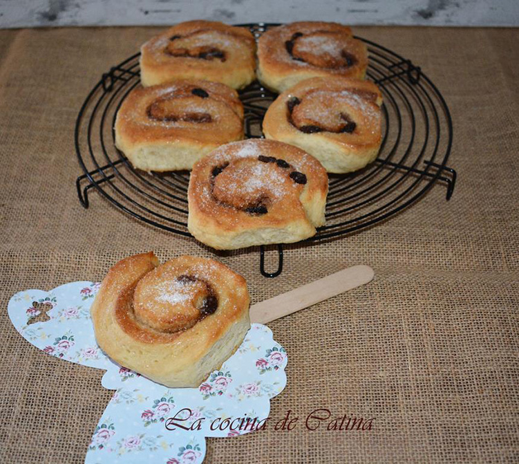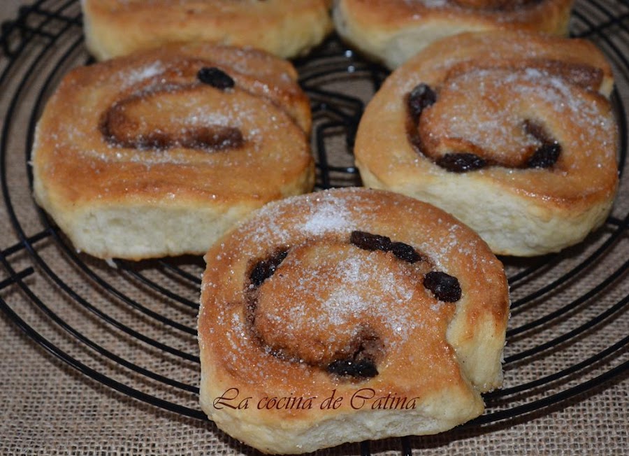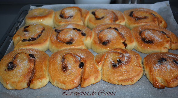 Desgasamos la masa y la dejamos reposar durante 10 minutos más. Estiramos la masa muy fina formando un rectángulo sobre la mesa de trabajo ligeramente enharinada. Derretimos la mantequilla y pintamos la masa con ella, espolvoreamos la mezcla de pasas escurridas junto con los azúcares y la canela. Enrollamos la masa sobre si misma, cortamos rodajas de un centímetro y las vamos colocando sobre una bandeja de horno cubierta con papel sulfurizado, los pintamos con huevo batido espolvoreamos con azúcar y dejamos reposar una hora más.