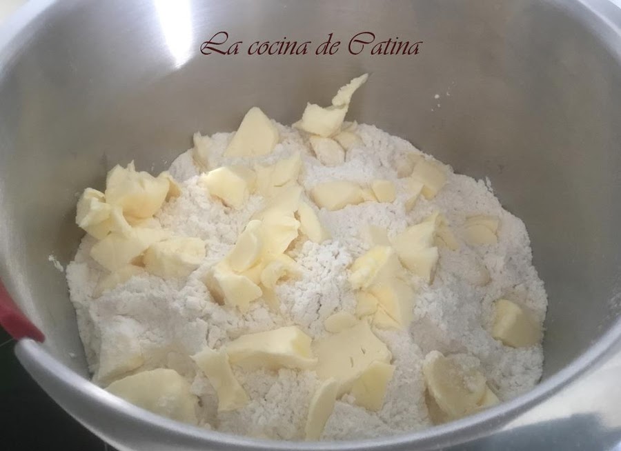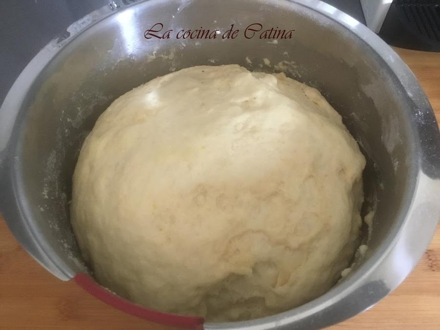 En un cuenco mezclamos la harina y la sal. Deshacemos la levadura y mezclamos todo bien, añadimos poco a poco la leche tibia y seguimos removiendo la masa ( en el robot se hace estupendamente con las varillas de amasar), añadimos el huevo ligeramente batido con el azúcar y la ralladura de naranja. Seguimos amasando para que se mezclen bien todos los ingredientes, cuando la masa esté ligada añadimos la mantequilla en trozos pequeños.
