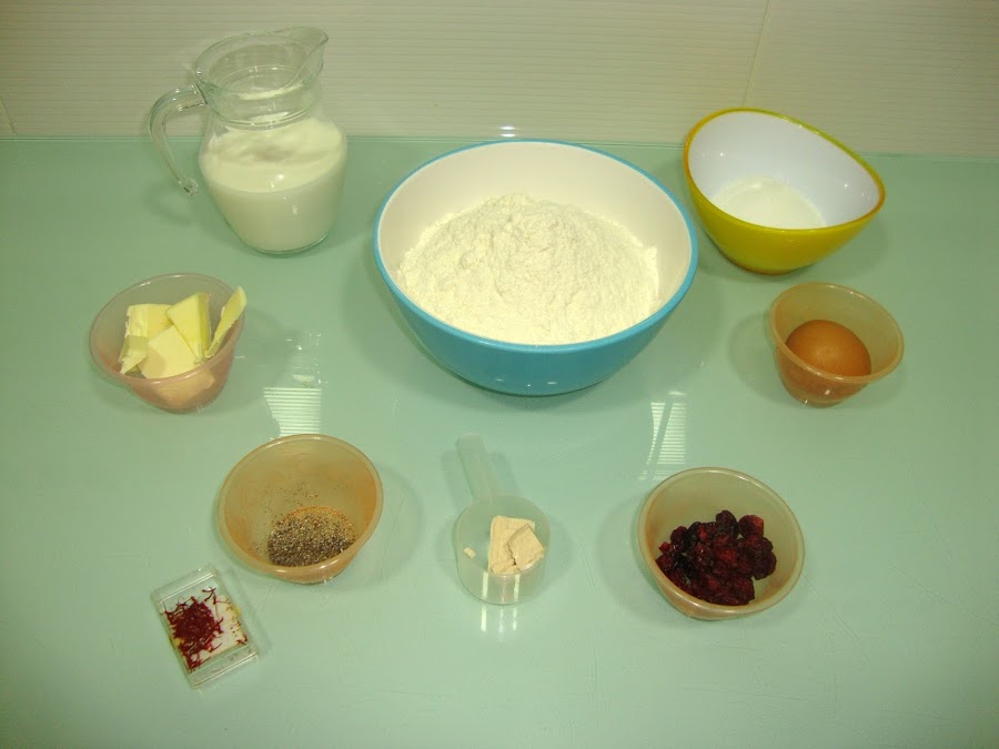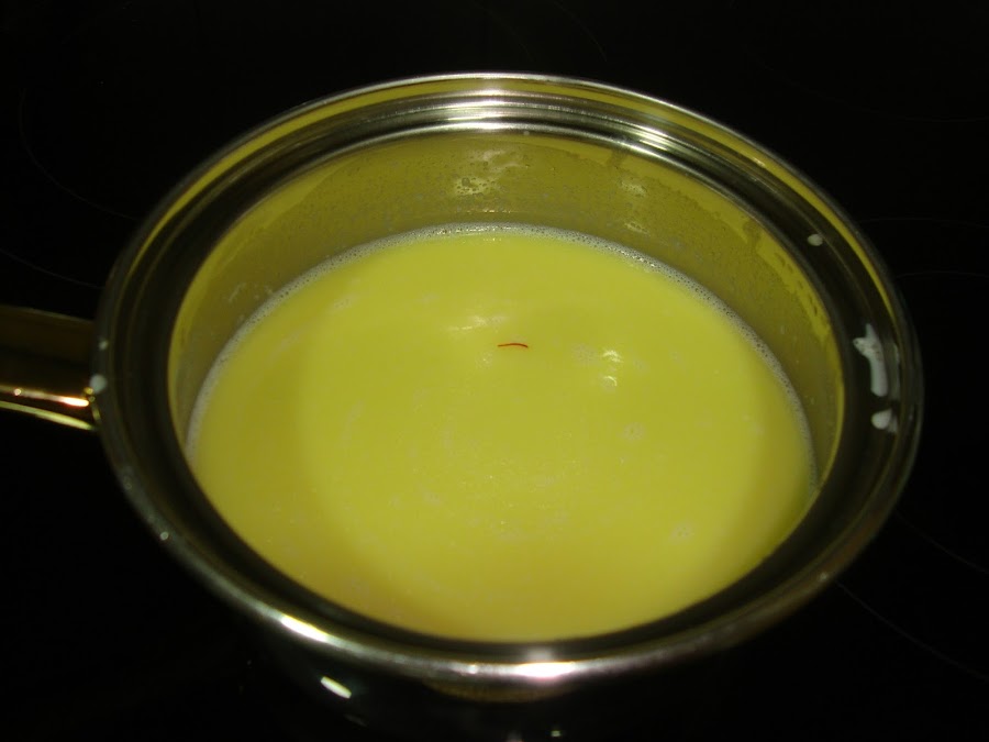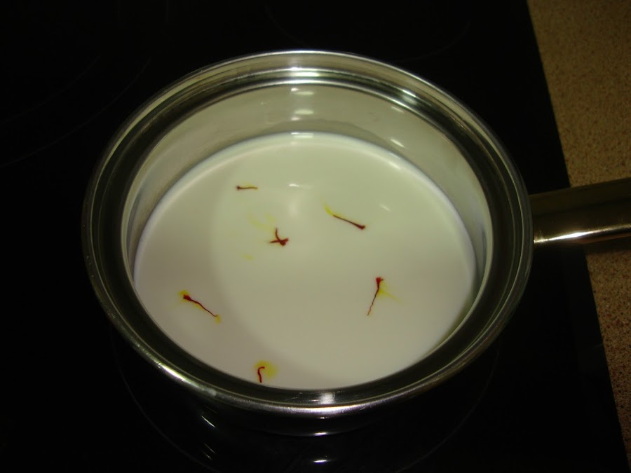 Calentamos en un cazo la leche con las hebras de azafrán y dejamos templar, luego añadimos la mantequilla y posteriormente la levadura fresca para que se disuelva.
