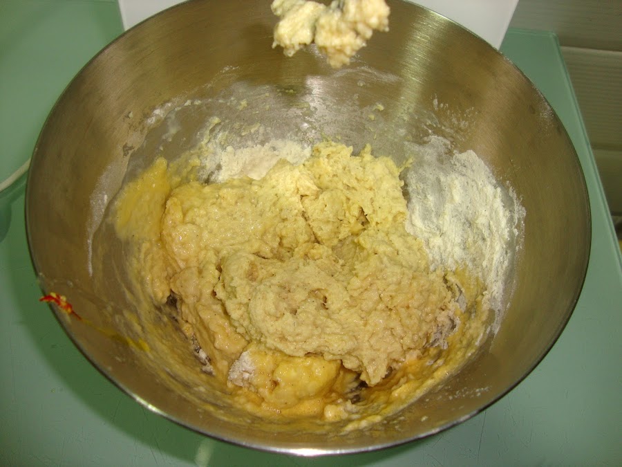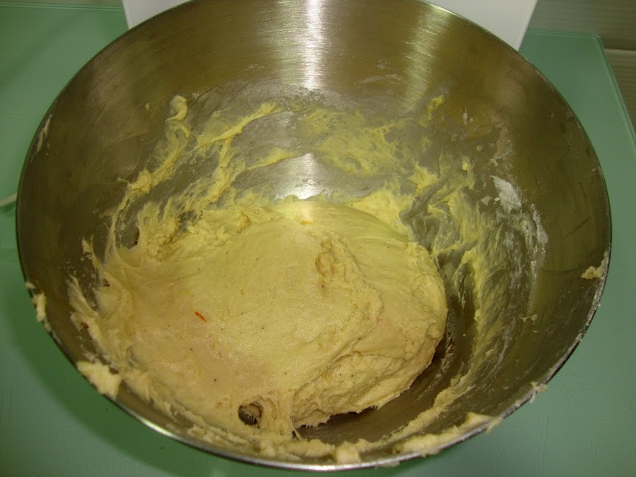 En un cuenco ponemos la harina, con la sal, el azúcar y el cardamomo, lo mezclamos y le añadimos el huevo batido y la mezcla de la leche. Lo mezclamos todo y amasamos con la amasadora o a mano hasta que la mezcla quede suave y lisa, es una masa bastante pegajosa.