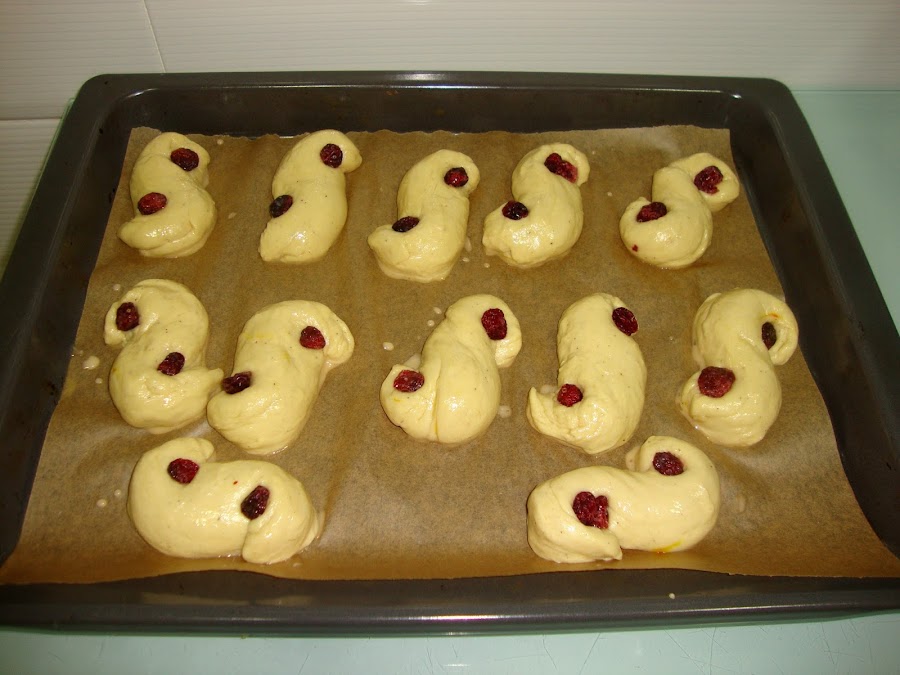 Luego con la yemas de los dedo o los nudillos la aplastamos ligeramente para que salga el aire y formamos bollitos de unos 80 gr en forma de S, para ello hacemos un cilindro y los enrollamos los dos extremos y ponemos una pasa, cereza o arándano en la unión (a mi no me quedó muy bien).