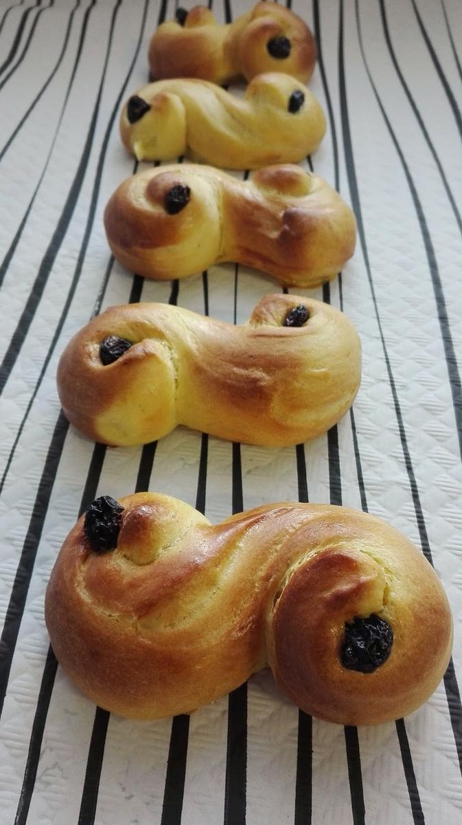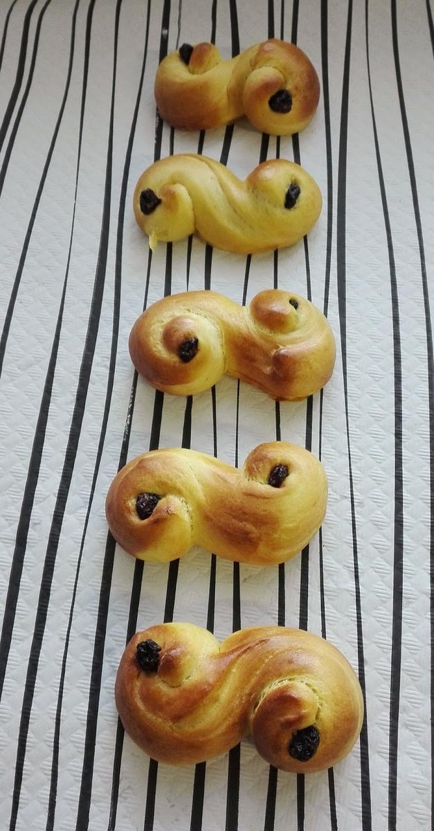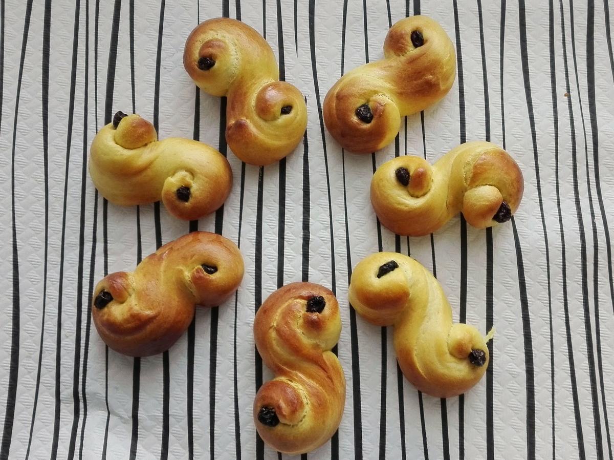 El lussekatt (plural lussekatter, literalmente gatos de Lucía, por santa Lucía) o pan de azafrán, también llamado julkuse, es un tradicional dulce navideño sueco con un característico color amarillo debido al azafrán que contiene. Se preparan tradicionalmente por la fiesta de santa Lucía, que en Suecia es una festividad importante celebrada el 13 de diciembre. – fuente Wikipedia