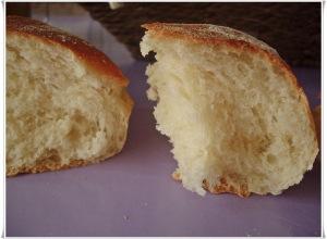 Con mucho cuidado (están delicados) y ayudándonos del trapo donde están levando, vamos cogiendo los bollos y los colocamos en la bandeja del horno (boca arriba esta vez). Los cocemos en el horno precalentado a 220º durante unos 15-20 min, con una bandeja de agua para generar vapor durante los primeros 10 min.