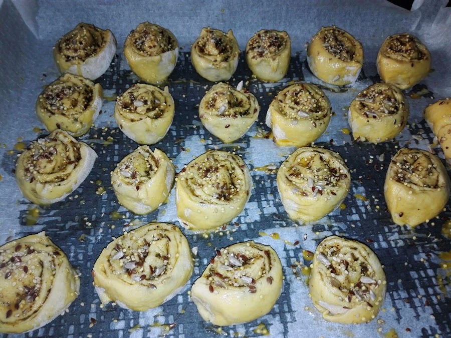 Enrollamos la masa a partir del lado más largo para formar un rollo alargado. Lo cortamos en unas 20 rodajas de unos 2 cm de ancho, Las colocamos en la bandeja previamente preparada con la cara cortada hacia arriba.