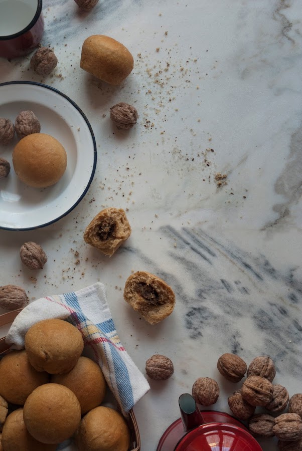 Estos bollos tan tiernos están hechos sin usar ni un ápice de mantequilla ni huevo y están rellenos de una pasta casera hecha a base de nueces molidas y miel, nada más.