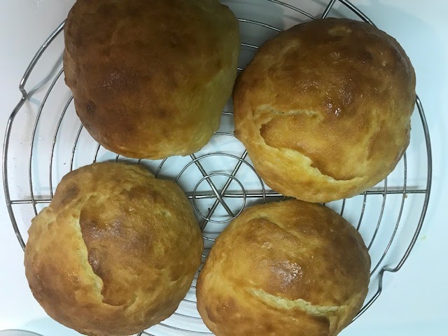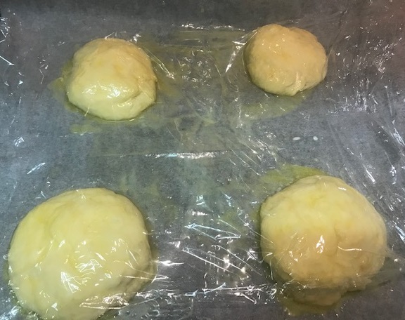 Pon mantequilla fundida en la bandeja del horno cubierta previamente con papel de horno y coloca las bolas de masa separadas (crece bastante) y píntalas con la mantequilla fundida. Deja reposar tapadas con papel film hasta que doblen su volumen.