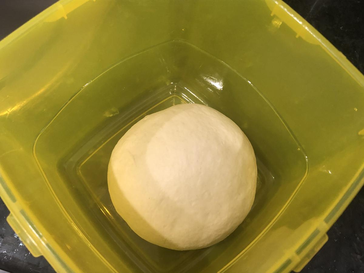 3. Pasados los 15 minutos, amasamos de nuevo otro poquito y la colocamos en un táper o recipiente amplio untado con una pizca de aceite y lo tapamos. Es importante que el recipiente sea grande ya que la masa crecerá bastante. Guardamos en la nevera y dejamos reposar durante 24 horas.