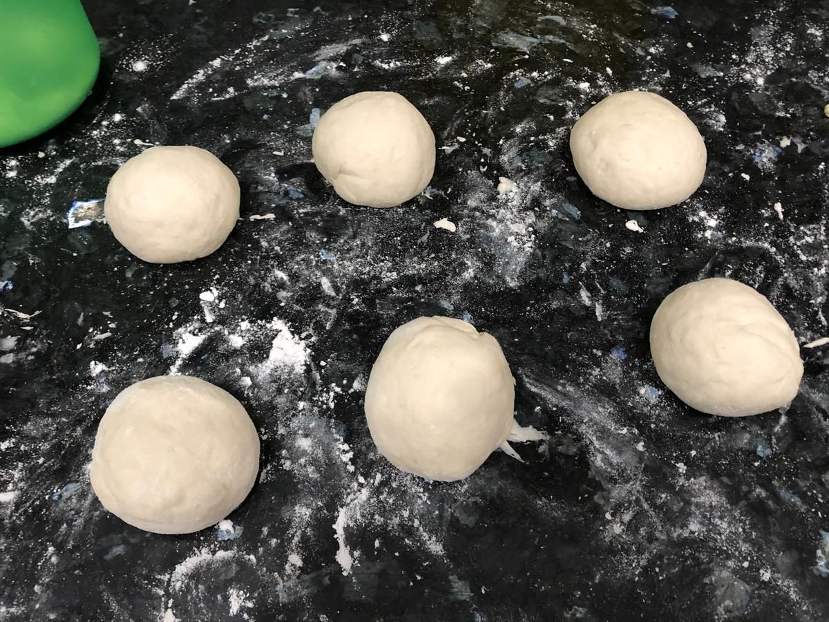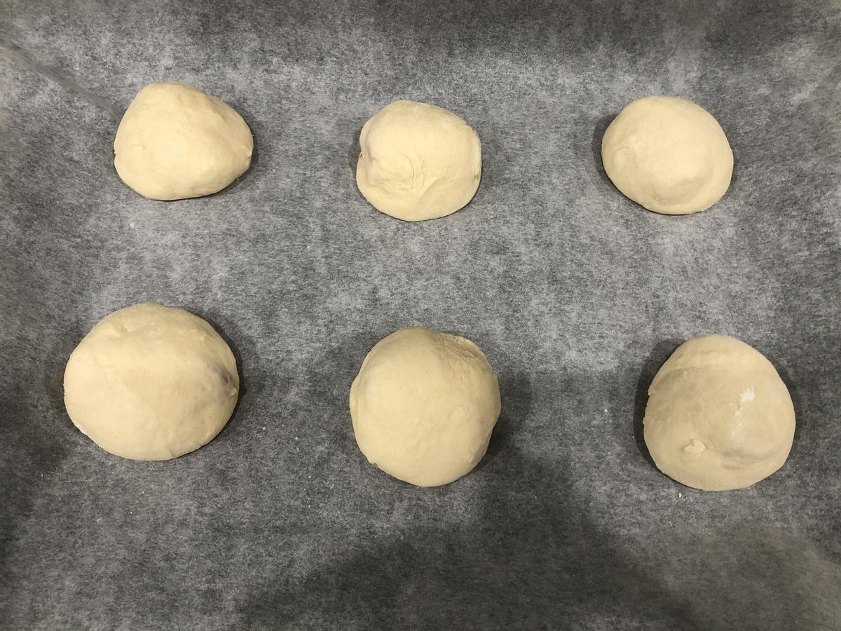 5. Cortamos la masa en 6 porciones del mismo tamaño (unos 60gr aprox. cada porción) y la damos forma de bola.