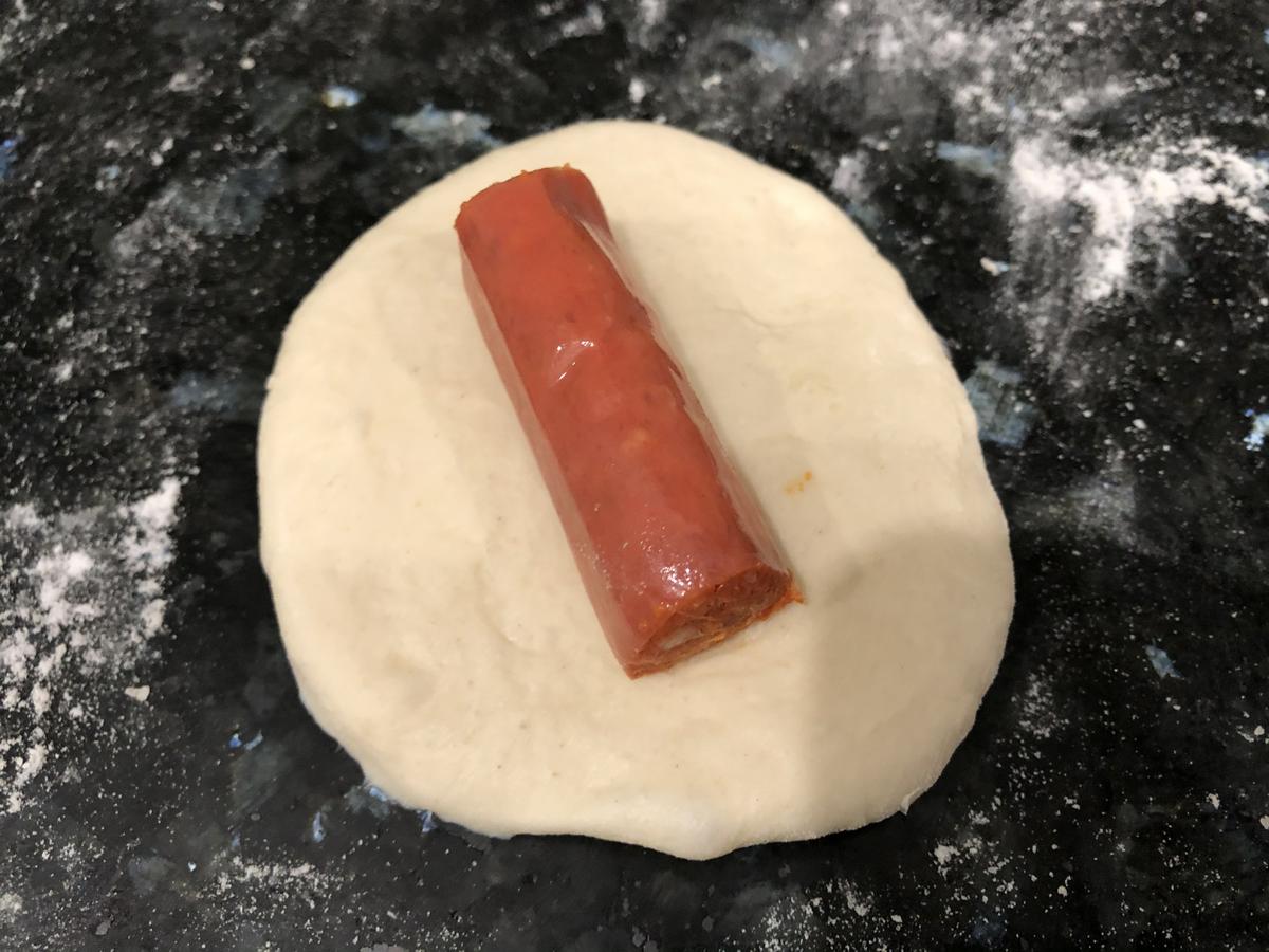 7. Aplanamos (sin presionar demasiado) cada bola con la palma de la mano y ponemos encima la chistorra. Cerramos la masa y plegamos hacia abajo, como si hiciéramos un paquetito.