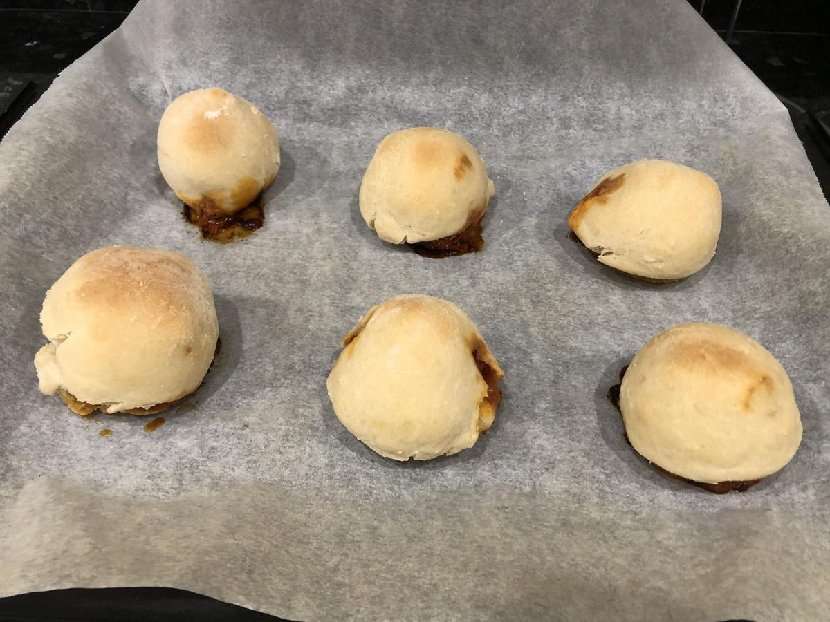 10. Sacamos del horno y apoyamos cada bollo unos segundos en papel absorbente para que pierda el exceso de grasa que puede haber soltado la chistorra. Dejamos que se templen un poco sobre una rejilla y servimos.