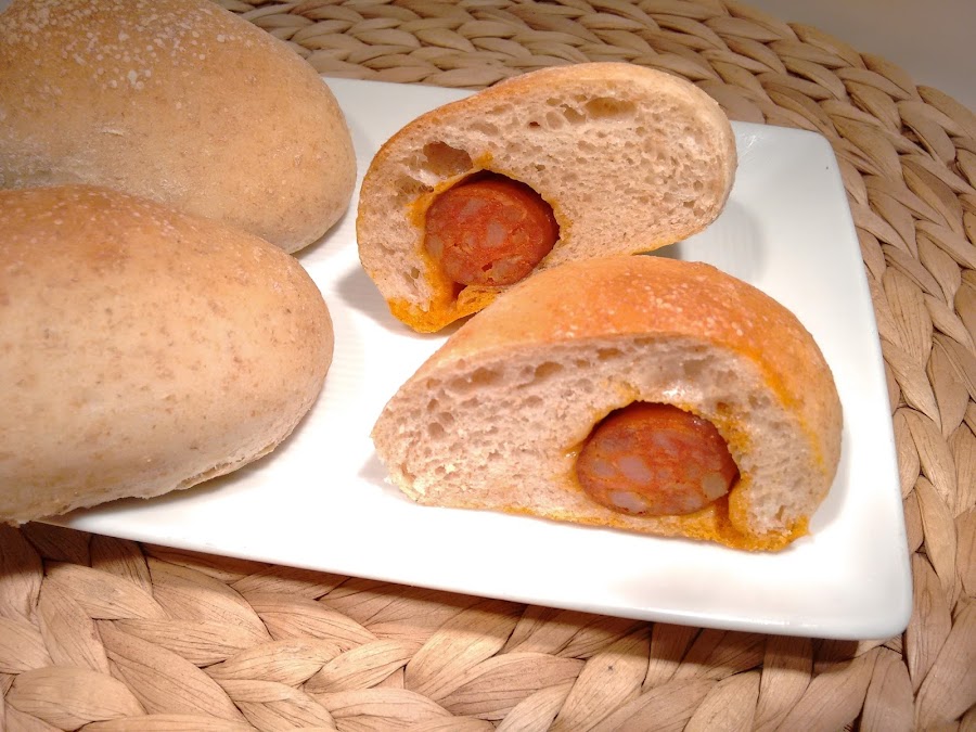 Pasado ese tiempo volvemos a amasar y hacemos bolas de unos 65-70 gr donde introduciremos trocitos de chistorra. La chistorra antes de meterla la desengrasé pasándola por la sartén para que perdiera parte de su grasa pero si queréis que quede el pan impregnado de la grasa de la chistorra saltaros este paso. Dejar las bolas sobre la bandeja del horno hasta que doblen su tamaño otra vez. Hornear a 270º con calor arriba y abajo durante 20 minutos o hasta que veamos que está tostado. mi recomendación es que antes de meter los bollos en el horno pongáis un vaso de agua para que se evapore y el horno tenga humedad.