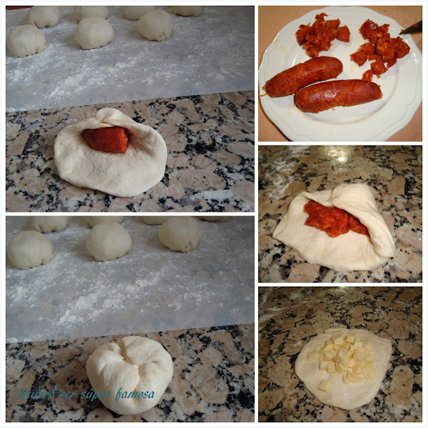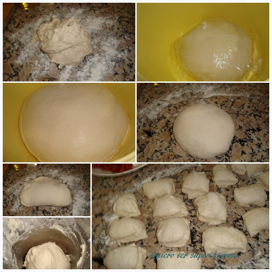 Observación: En la segunda fila de la fotografía, a la izquierda de la misma, podéis ver la masa fermentada con la superficie bien lisa. Ya está lista para formar los bollitos.