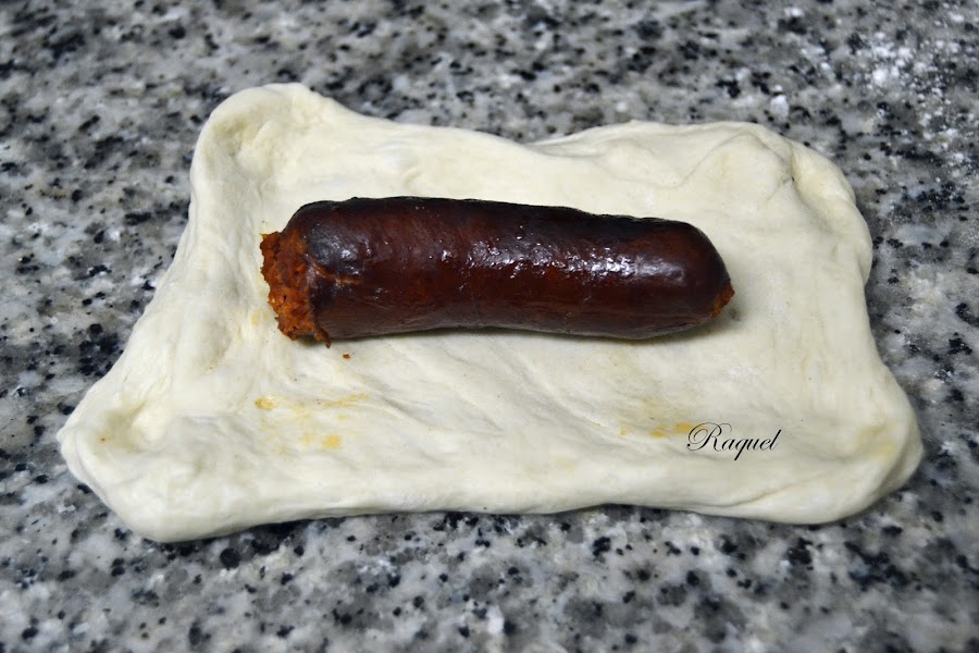 Estiramos la porción de masa y ponemos en el centro el chorizo.
