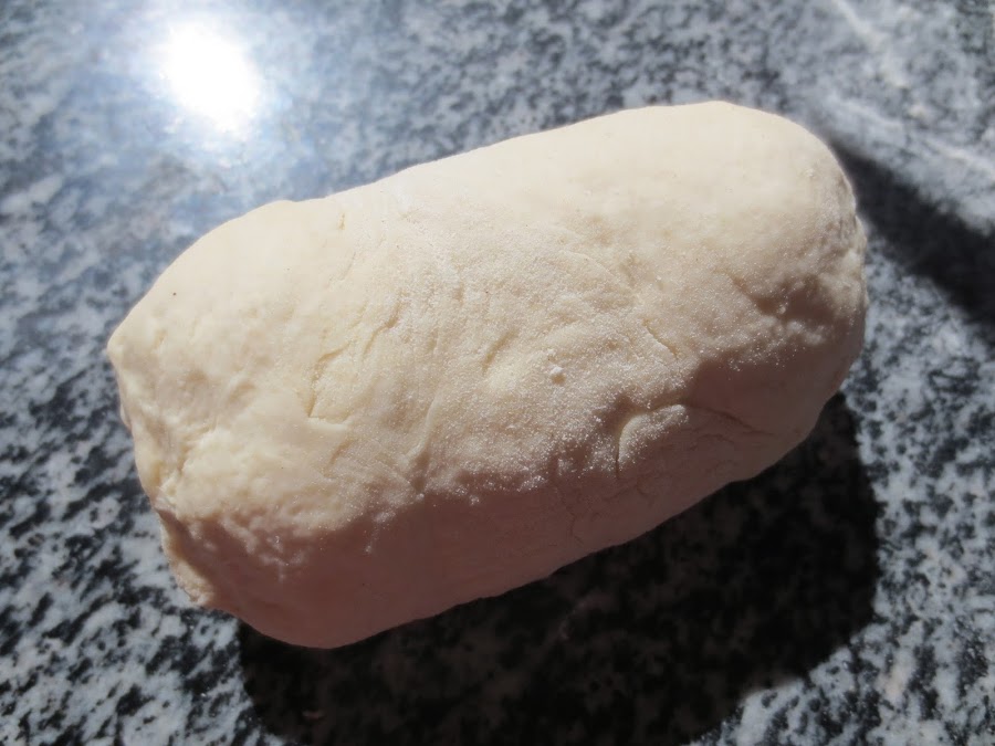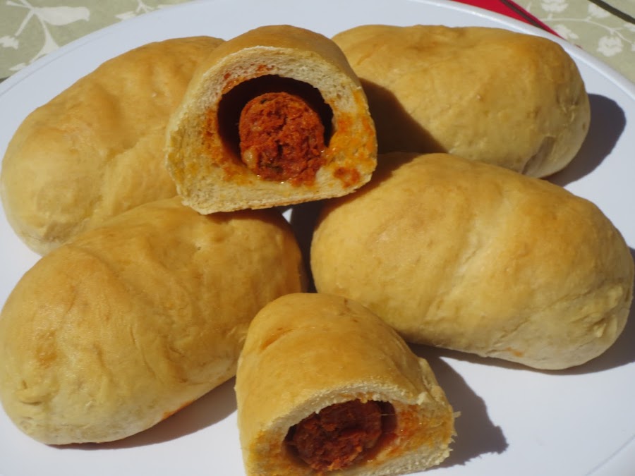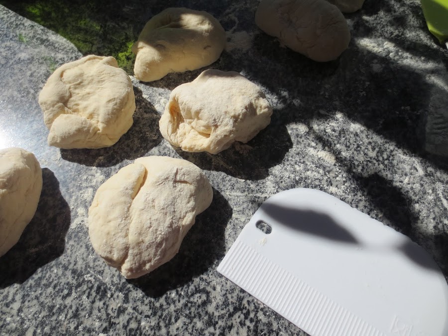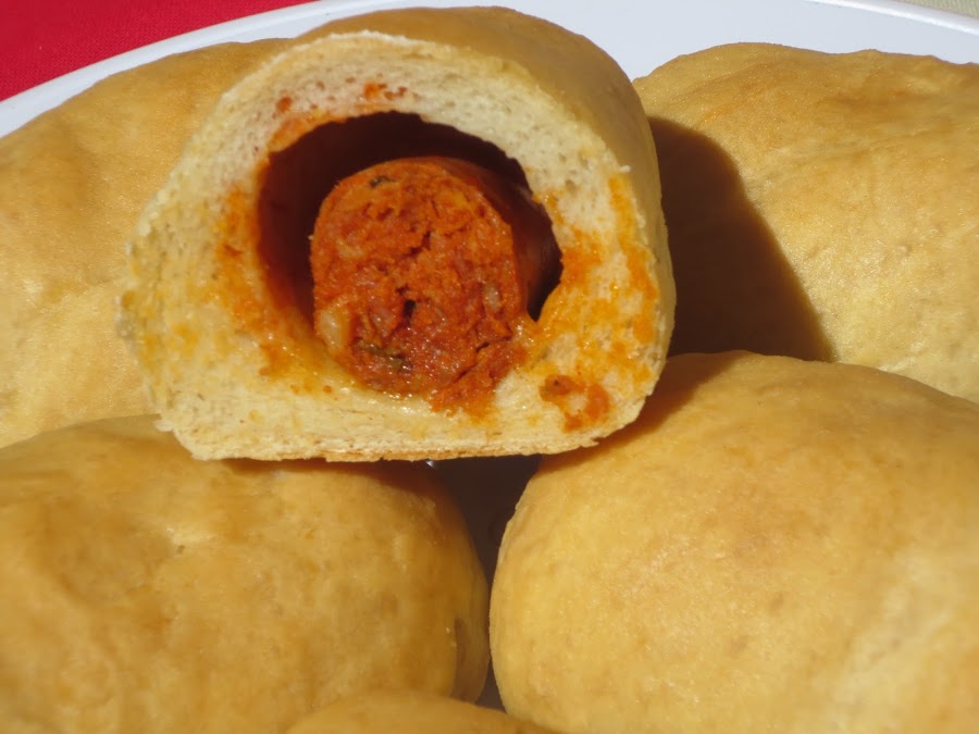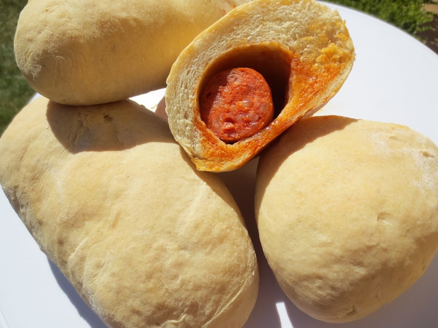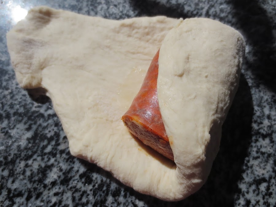 3- Desgasificar (Quitar el aire amasando un poco) , la masa sobre la meseta espolvoreada con harina, cortar en porciones de unos 120 gramos, estirar con el rodillo, poner en un extremo un trozo de chorizo fresco u enrollar, rodando el bollito un poco por la meseta para que se peguen los bordes y cierren bien.