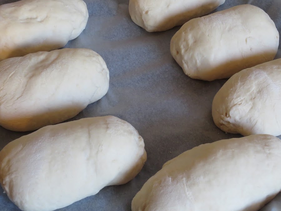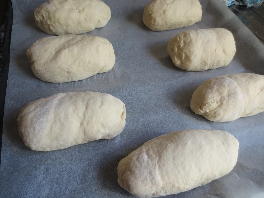 Ir colocando en una bandeja sobre papel de hornear , separados un poco entre sí. Tapar y dejar levar una media hora, mientras precalentar el horno a 250º , con un cacharrito de agua en el fondo del horno.
