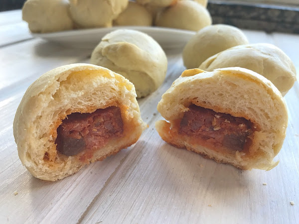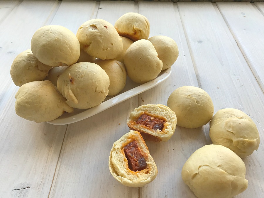 5. Vamos haciendo bolitas, no demasiado grandes con la masa. Las aplanamos con las manos, metemos dentro una rodaja de chorizo y cerramos la bolita de masa de nuevo, dejando el chorizo dentro.