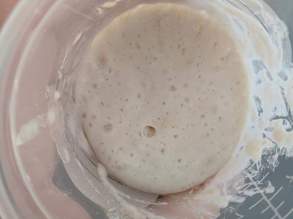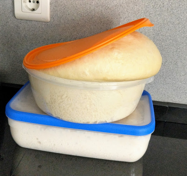 6. Dejamos a temperatura ambiente unas 3 horas, que arranque muy bien el levado. Pon después en la habitación más fría de la casa o bien deja en la nevera durante unas 10 horas. Yo por logística tuve que dejarla en la cocina a unos 20 grados y claro, pasó esto