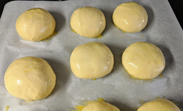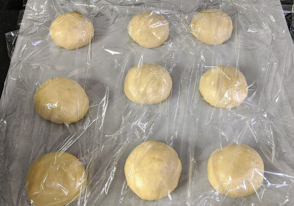 8. Tapamos con film, para que no se reseque la masa, y dejamos que aumenten como un 50% su volumen. Entonces encendemos el horno a 190 grados