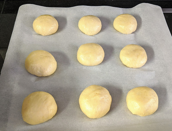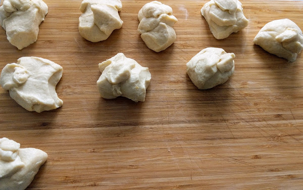 7.Dividimos la masa en porciones de 55-60 gramos. Cada porción la plegamos formando un pequeño hatillo y voleamos dando tensión