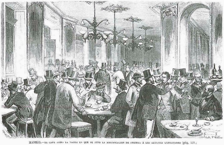Los cafés suizos eran el lugar de encuentro de la flor y la nata (crema de leche) de la sociedad. Alli se iba para para merendar chocolates y bollos y estar al tanto de las noticias más recientes sin necesidad de leer los periódicos. También sirvieron de tribuna pública y de salas de negociación en las que se debieron de cerrar cantidad de tratos que nos afectan todavía hoy.