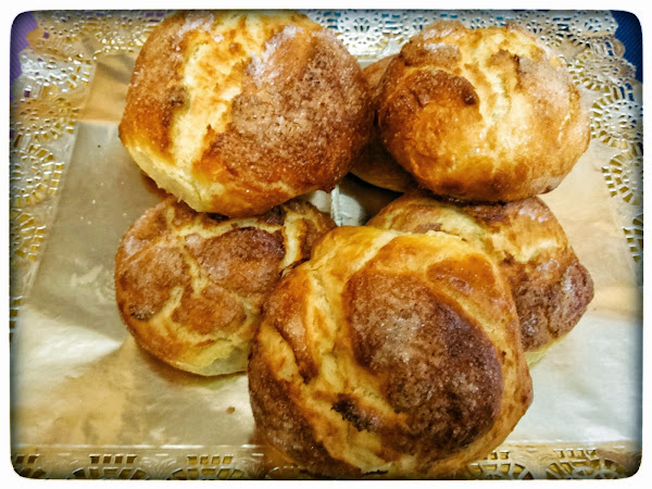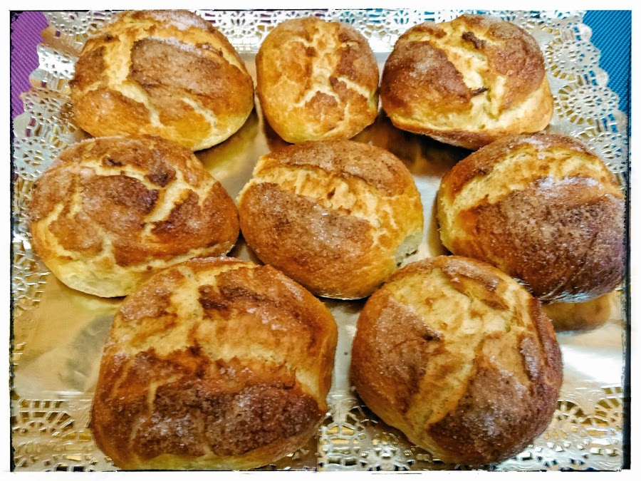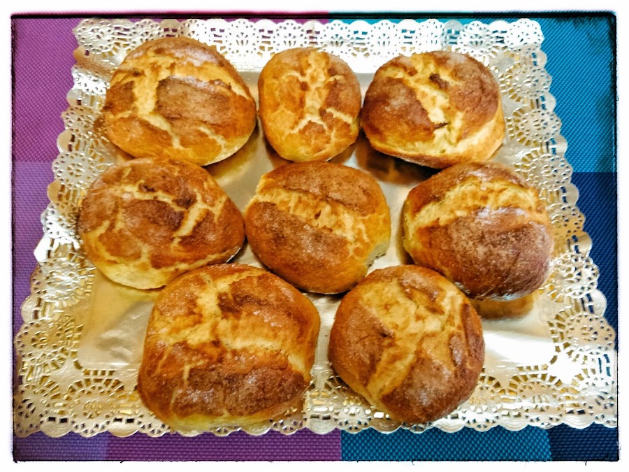 Precalentamos el horno a 200 grados y ponemos en una bandeja papel vegetal y vamos haciendo unas bolas con la masa lo mas redondo posible hasta terminar con la masa, ahora los pintamos con huevo batido y le hacemos un corte en el centro con ayuda de un cuchillo y espolvoreamos azúcar encima.