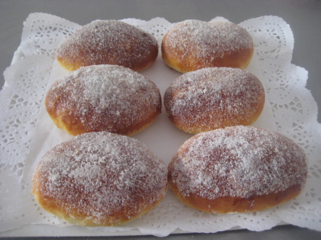 Preparación: Poner todos los ingredientes en la amasadora, menos la sal y dejar amasar unos minutos. Luego añadir la sal y dejar que vuelva a amasar, hasta obtener una masa elástica y fina. Dejar reposar en bloque un buen rato o bien dejar en cámara bien tapada hasta el día siguiente.Cuando la masa de bollería haya reposado el tiempo suficiente o la hayamos dejado en la nevera hasta el día siguiente, pesar porciones de 70 gr. y formar los bollos dando forma de panecillos achatados por las puntas y en este caso sin hacer corte alguno. Colocar en bandejas con papel de horno y pincelar con huevo batido y fermentar en un lugar cálido y sin corrientes de aire. Cuando estén fermentados cocer en el horno a 190º C hasta que hayan desarrollado bien y estén dorados, entre 10 y 15 minutos, depende de los hornos. Retirar de la bandeja y colocar sobre rejilla. Fundir la mantequilla y antes de que se enfríen pincelar cada bollo generosamente y seguidamente pasarlos por el azúcar. Dejar que se enfríen totalmente y listos para comer.