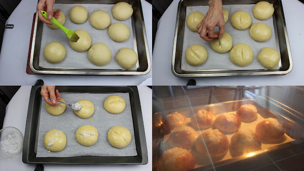 Boleamos cada una de las porciones, las colocamos en la bandeja de horno, las tapamos y las dejamos en un sitio cálido para que vuelvan a levar y doblen su volumen.