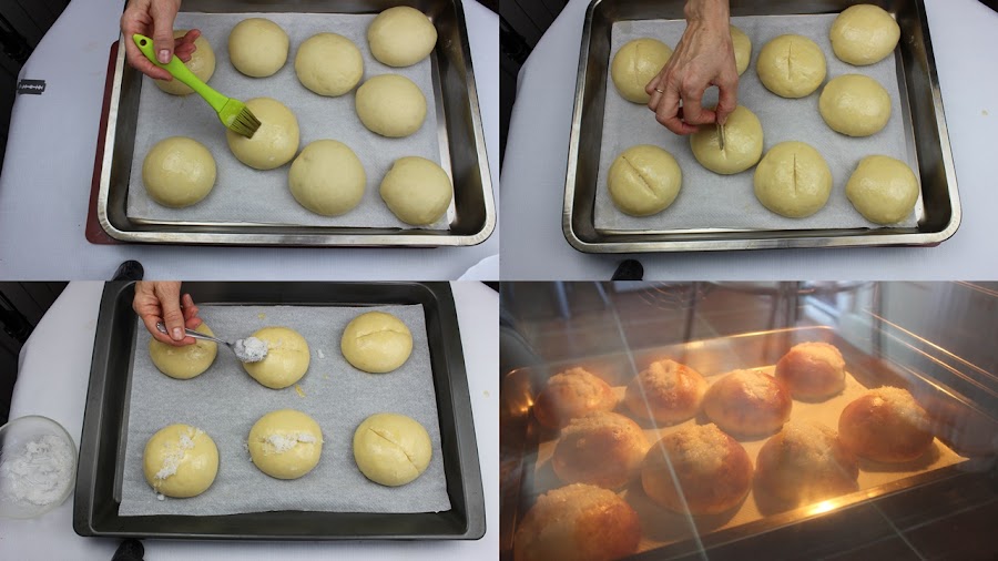 Cuando hayan levado y doblado su volumen, pintamos con huevo batido los bollitos y le hacemos un corte por arriba, les ponemos abundante azúcar humedecida con el licor de anís en el corte que hemos hecho al bollito.