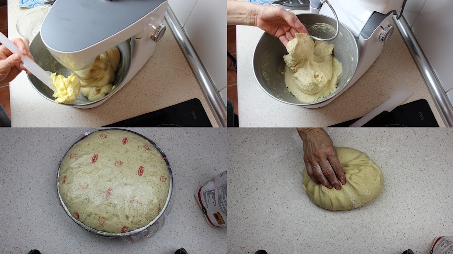 Cuando haya doblado su volumen, la sacamos, la ponemos en la encimera ligerísimamente enharinada y la desgasificamos presionando ligeramente con las manos.