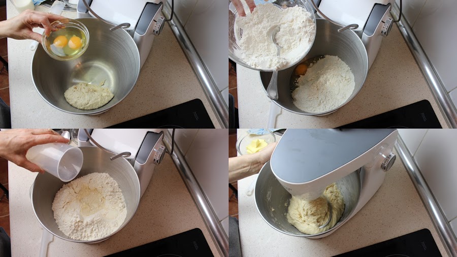 En la amasadora o robot ponemos, el resto de harina, la sal, la leche, los huevos y el prefermento. Amasamos hasta que todo esté integrado.