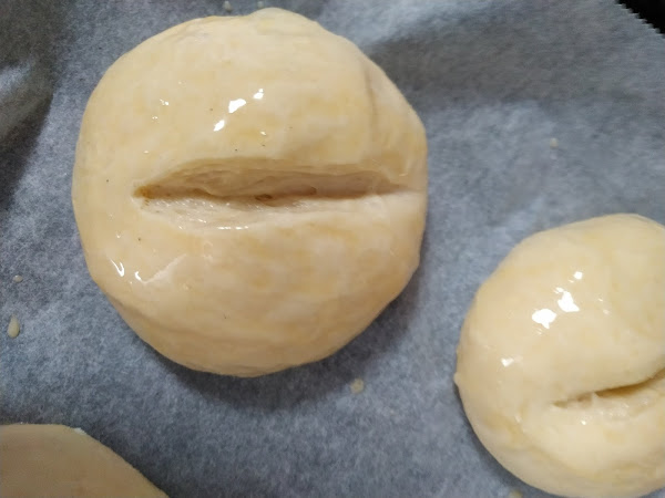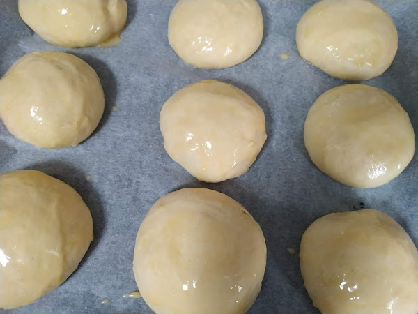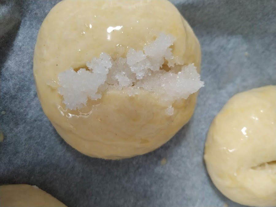 Pintamos los bollos con mucho cuidado con el huevo batido y justo antes de meter en el horno les hacemos un buen corte que rellenaremos de azúcar humedecido.