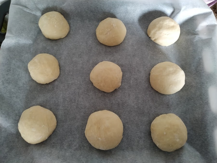 Dejamos reposar las bolitas en la bandeja del horno, sobre papel sulfurizado, tapadas, durante 90 minutos, hasta que casi doblen su tamaño.