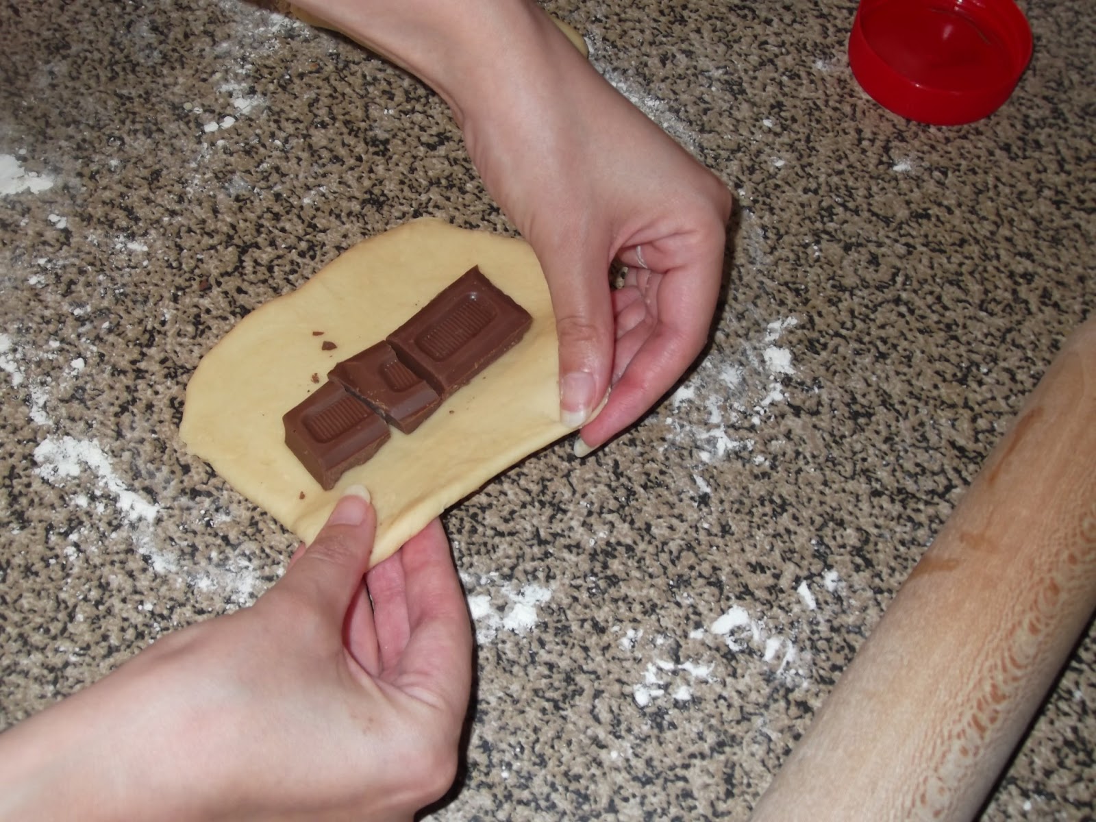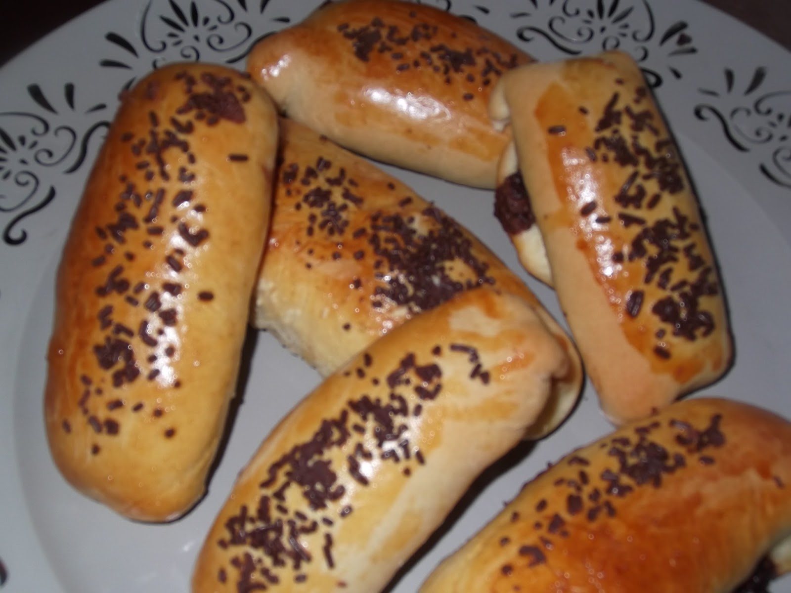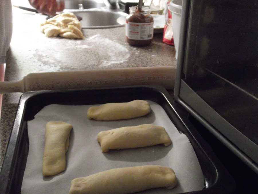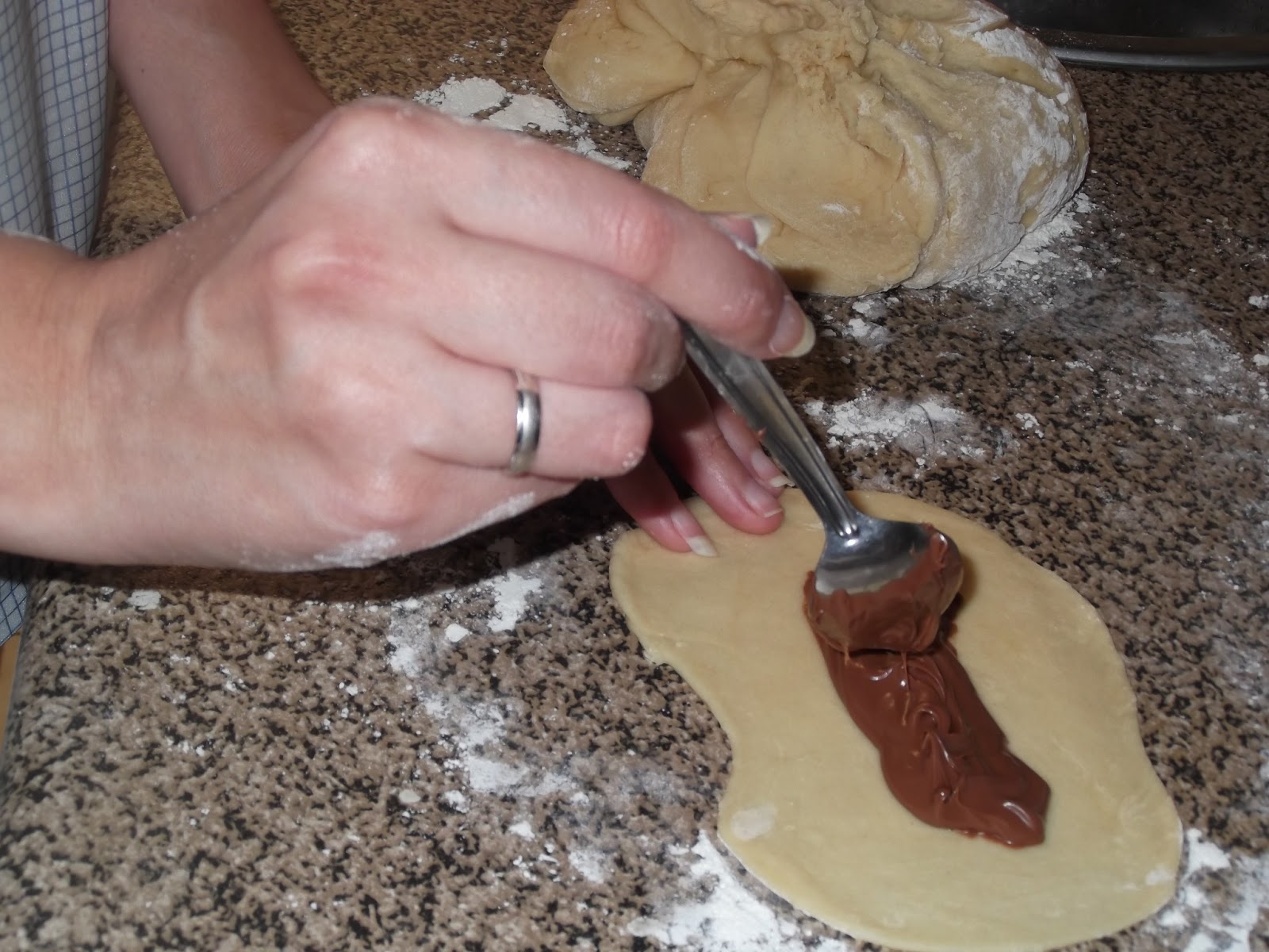 Pasado este tiempo, volvéis a amasar un poco la masa para quitarle todo el aire y vais cortando cachos, la aplanáis con un rodillo, ponéis una cucharada de nocilla en el centro y los cerráis con la forma del bollycao, los ponéis en una bandeja de horno y los pintáis con el huevo que os había sobrado, yo a algunos les puse fideos de chocolate por encima para que quedarán más bonitos. Ahora los volvéis a dejar reposar otro rato y mientras tanto vais precalentando el horno a 180º.