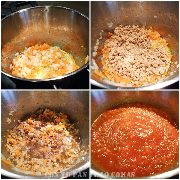 4. Ponemos el tomate triturado, sal y un poco de azúcar para quitar la acidez, y bajamos el fuego para que se haga todo lentamente, yo lo dejé más o menos una hora.